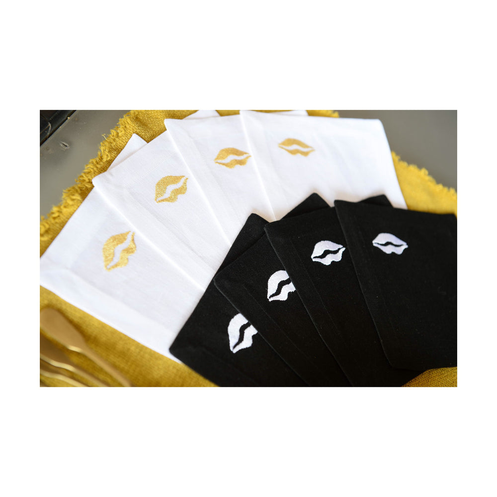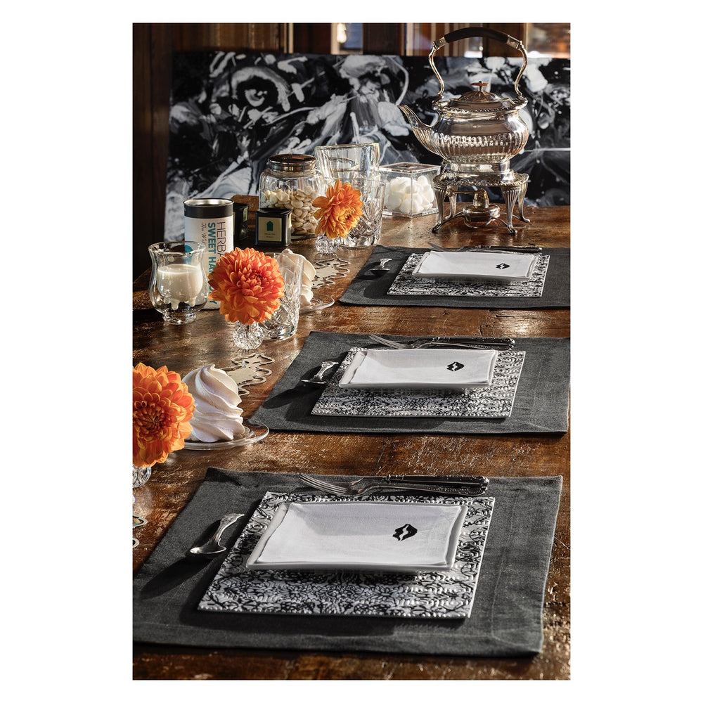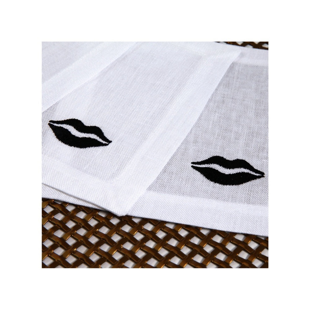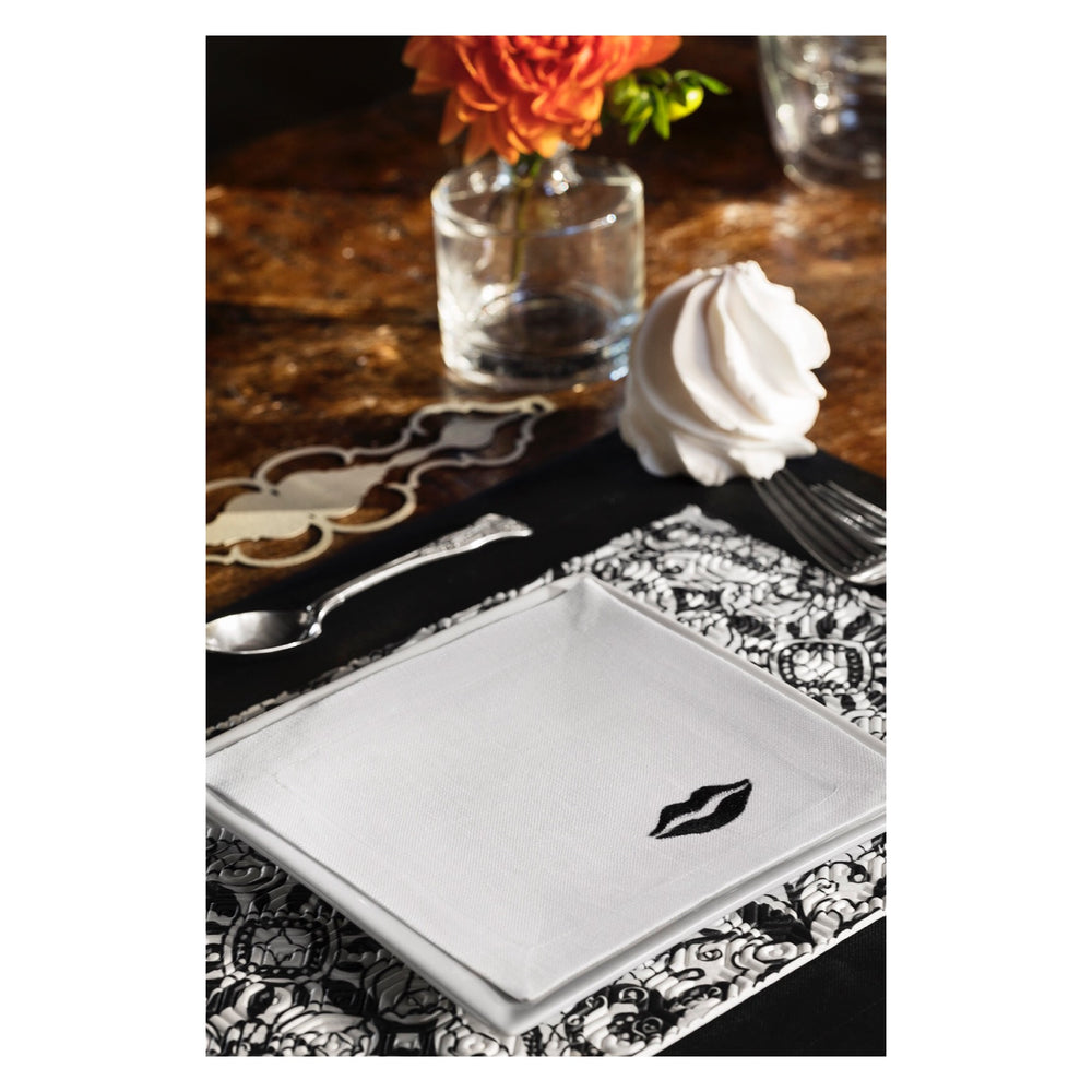 Embroidered fine linen napkins. A catchy detail for the classic tabletop, perfect for striking a conversation at any cocktail party.