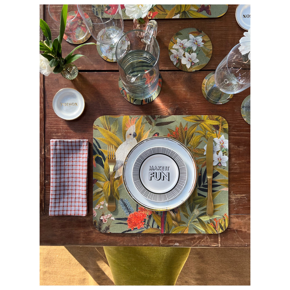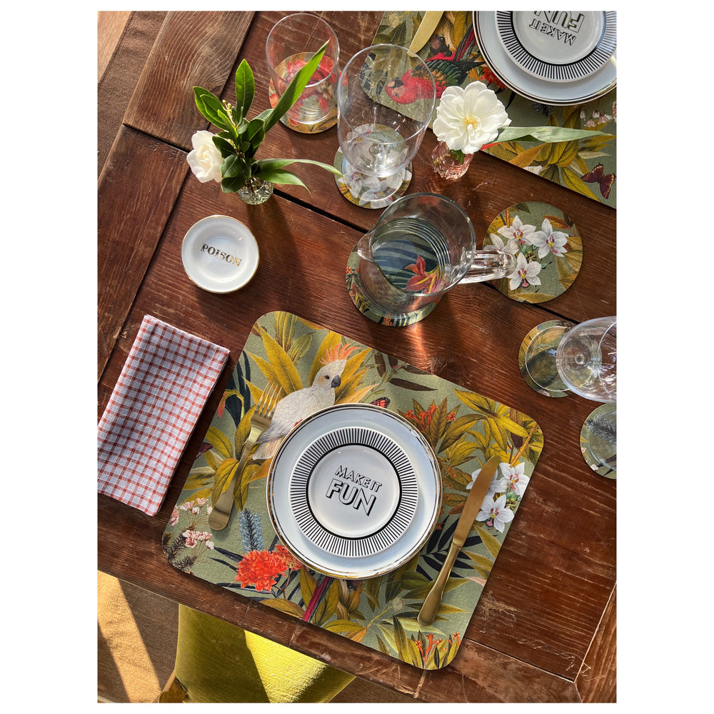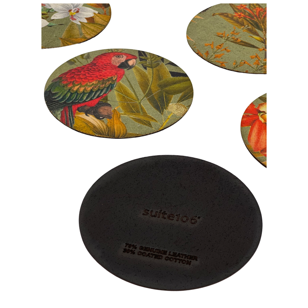 Made of coated cotton and genuine leather. Each coaster is different from the other because it is the result of cutting from a single fabric with continuous pattern.