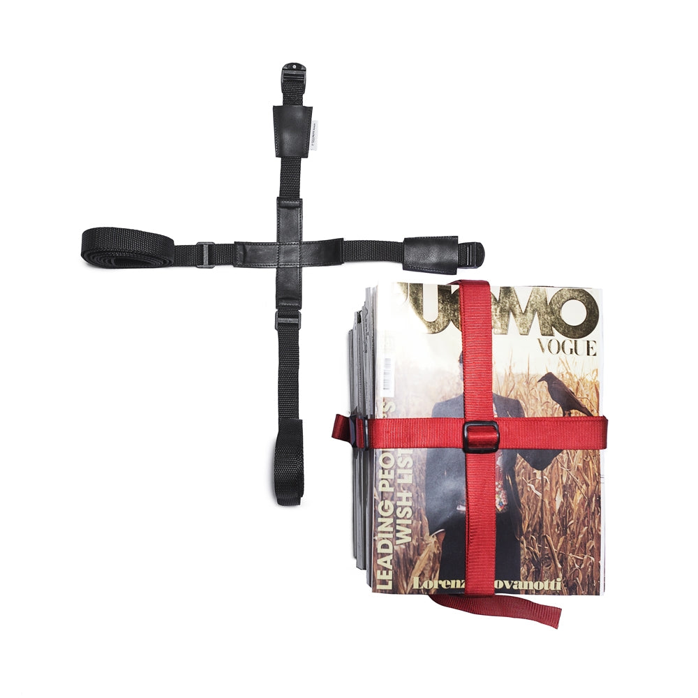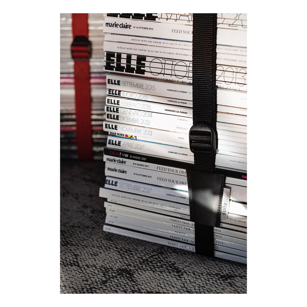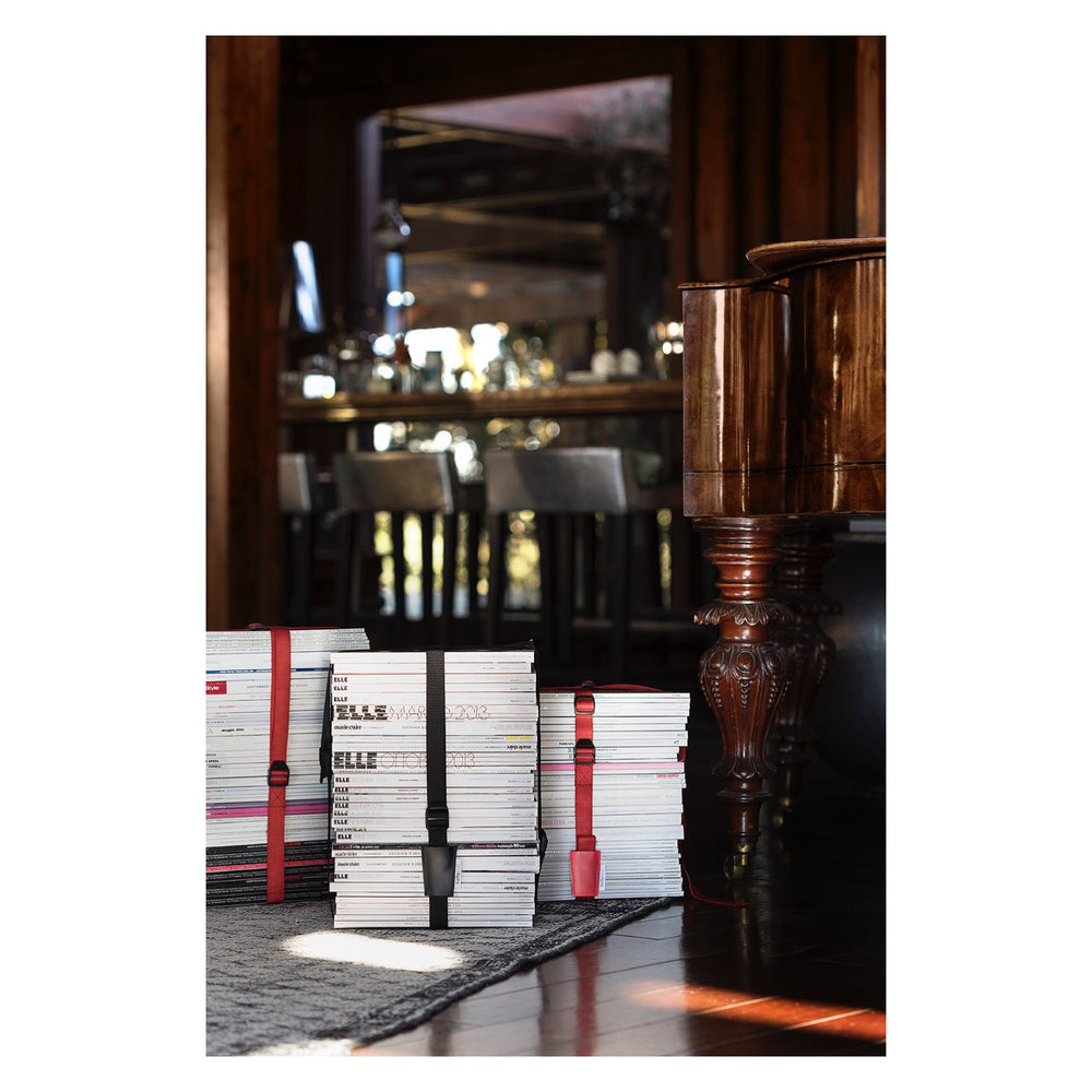 Drawing upon Suite106's love of reloading objects, the Elle Book Stool Strap features adjustable leather and nylon strap with closure and two nylon buckles with leather cover perfect to turn your archives into a cool stool or side table by stacking magazines and strapping them in.