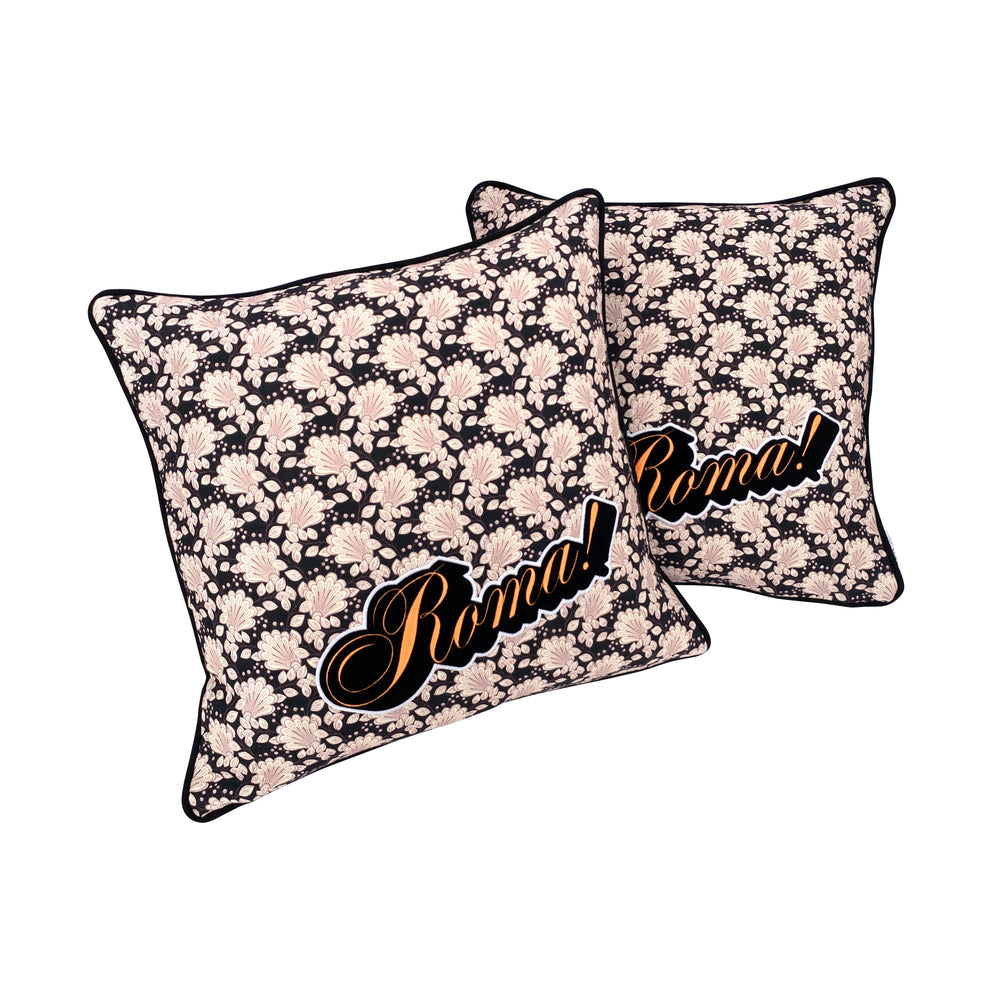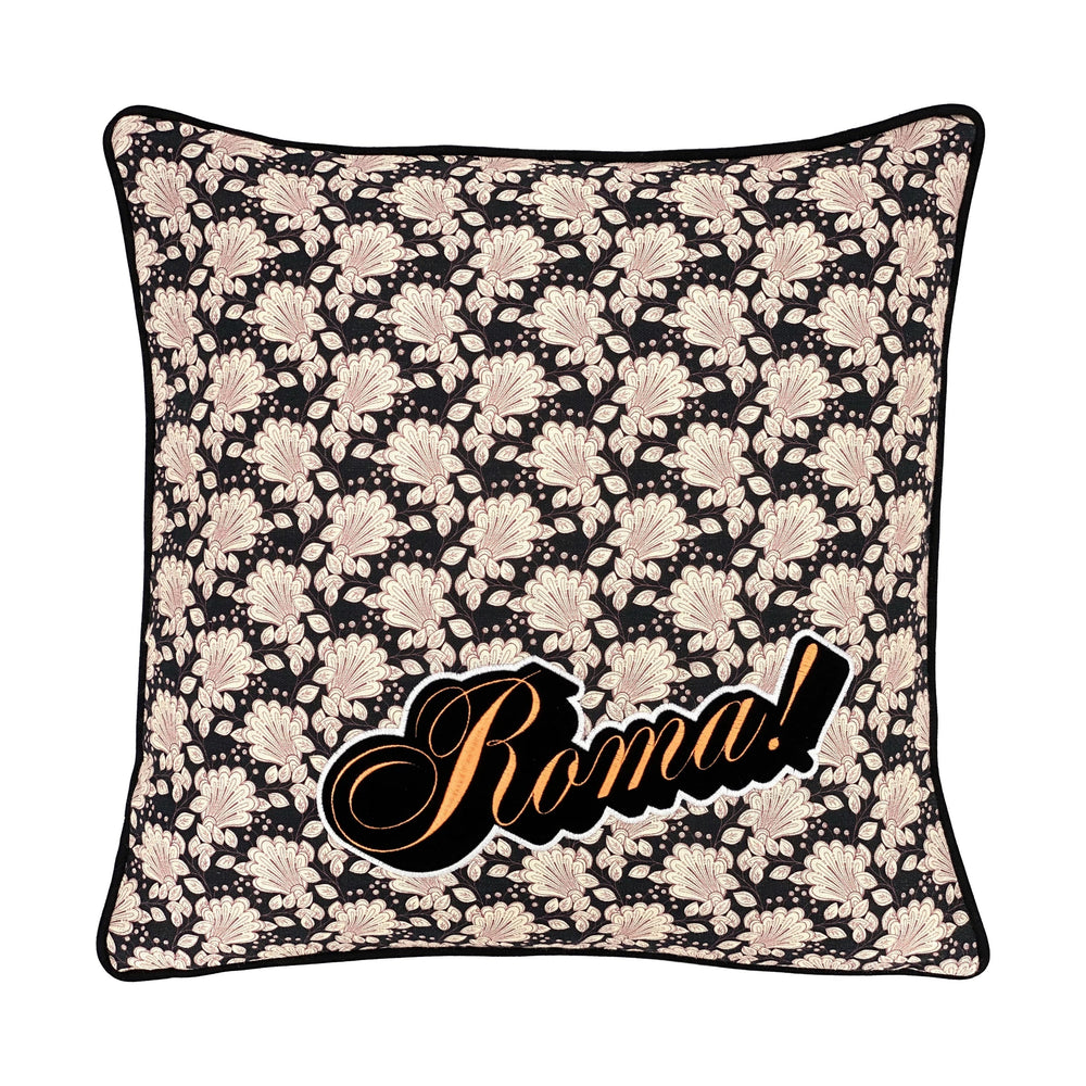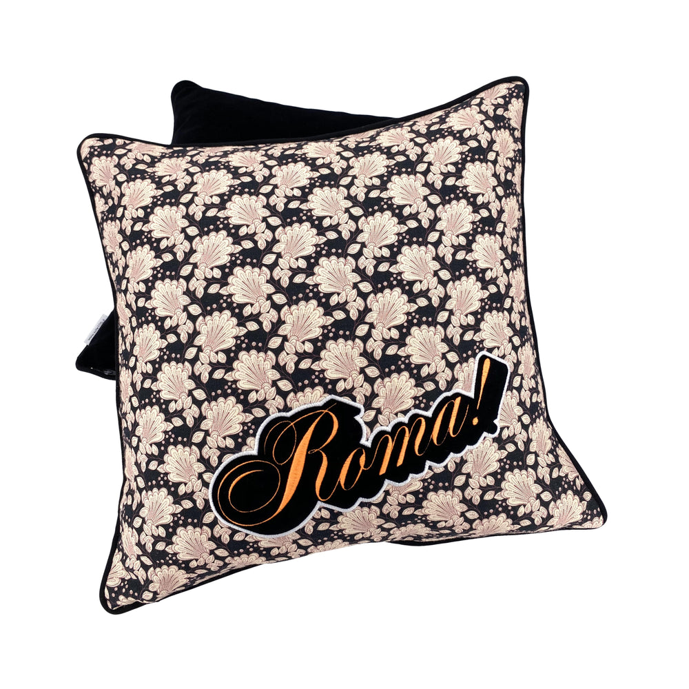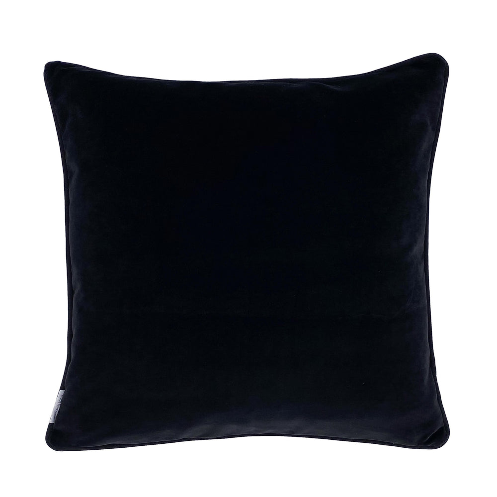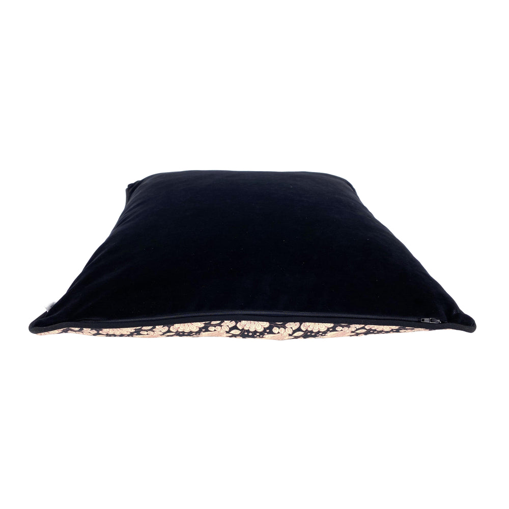 Embroidered printed linen on the front, solid black color velvet on the back, this pillow provides two looks for one.