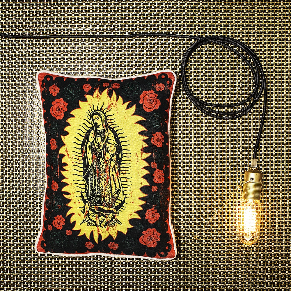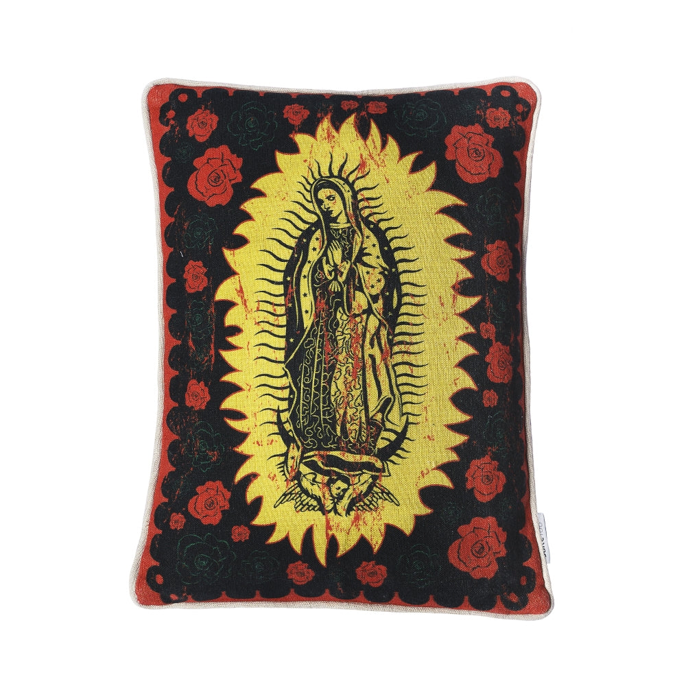 Featuring a luxurious natural linen printed pillow with an iconic image of the Virgin of Guadalupe on the front, this
