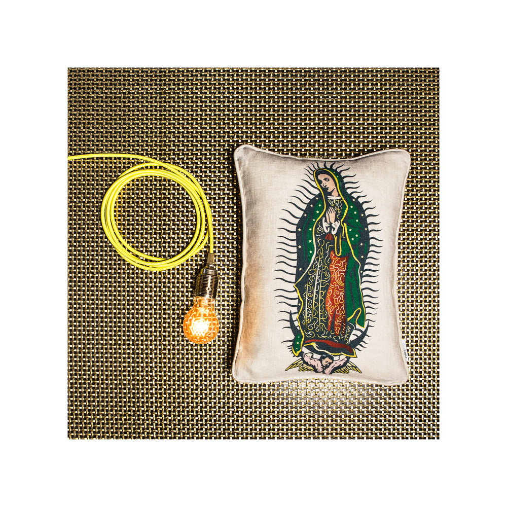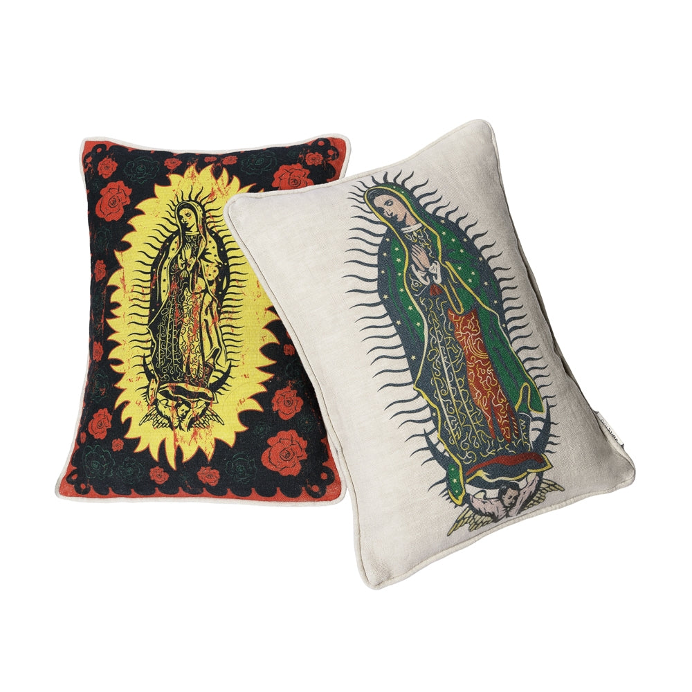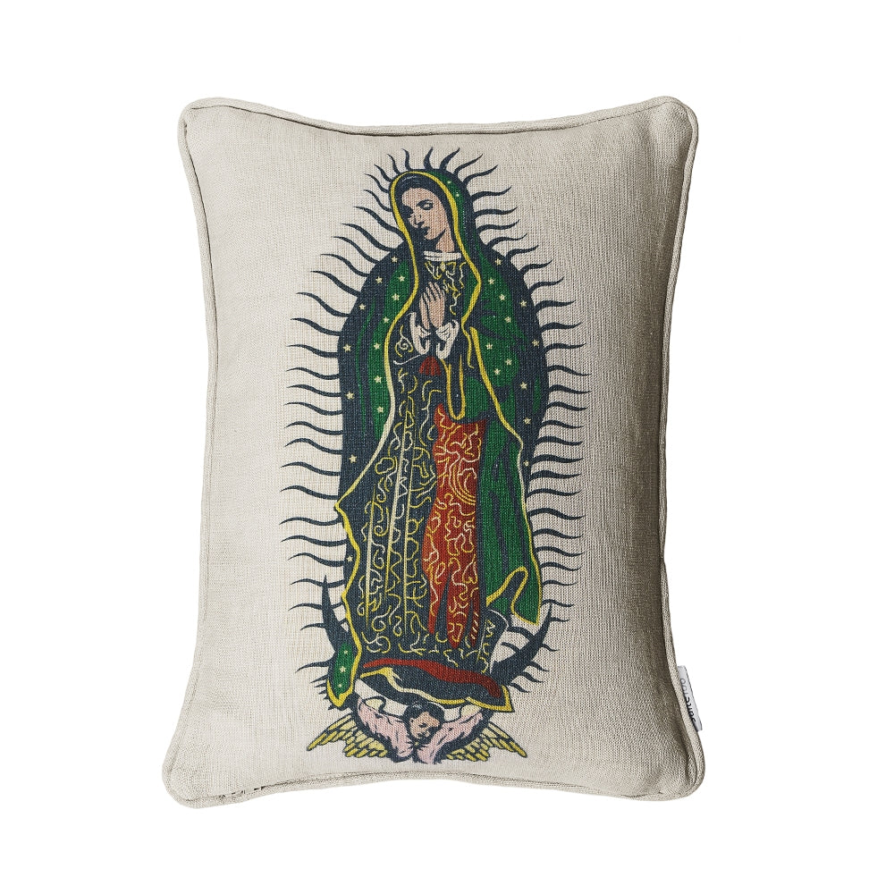 Featuring a luxurious natural linen printed pillow with an iconic image of the Virgin of Guadalupe on the front, this striking and Mexican inspired pillow is a charismatic and artfully curated addition to any space. Chic and full of soul, this pillow celebrates a popular cultural icon, a venerable symbol of compassion, hope and humility.