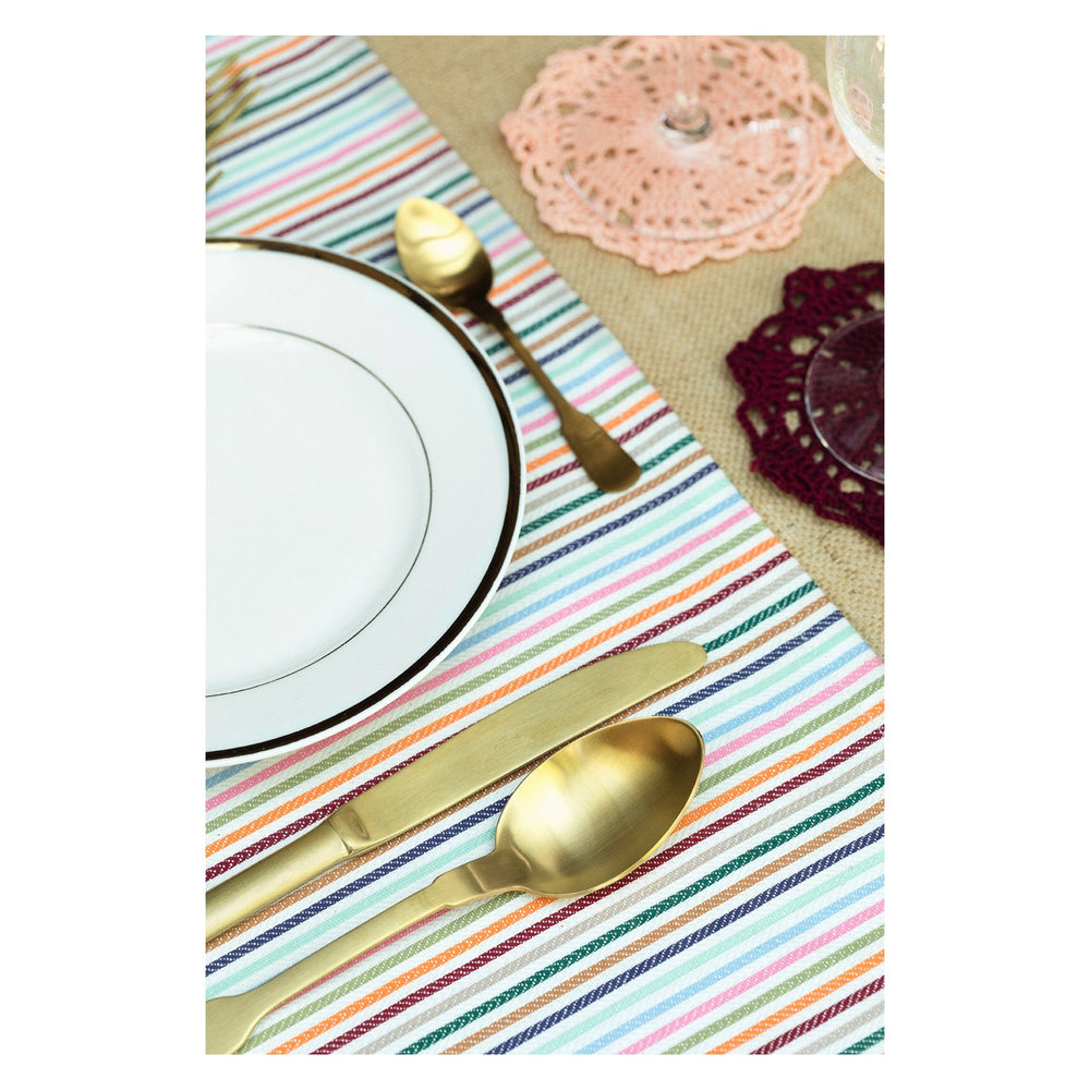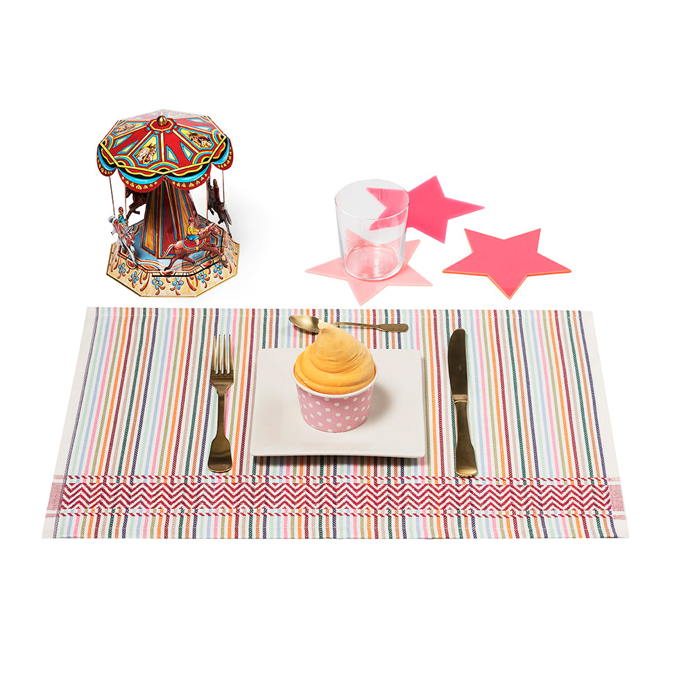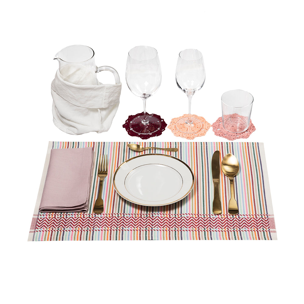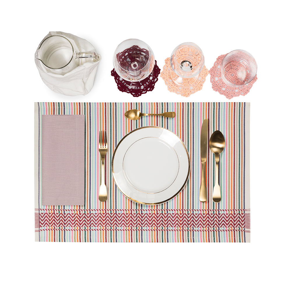 Suite106 reimagines the baiadera fabric – inspired by the flowing dresses of traditional Indian costumes – to create this multicolored striped placemat.